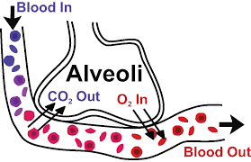In alveoli , Partial pressure of oxygen in alveoli and carbon dioxide in capillaries is 100 and 40 mm of Hg respectively . so due to this pressure deficit oxygen diffuses in and carbon dioxide out .