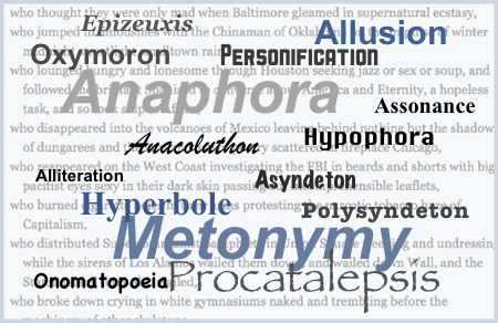| 2. |  Anaphora |    repeating a word or phrase in successive phrases which creates parallelism and rhythm. Let freedom ring from the heightening Alleghenies of Pennsylvania! Let freedom ring from the snowcapped Rockies of Colorado! Let freedom ring from the curvaceous peaks of California! But not only that; let freedom ring from Stone Mountain of Georgia!